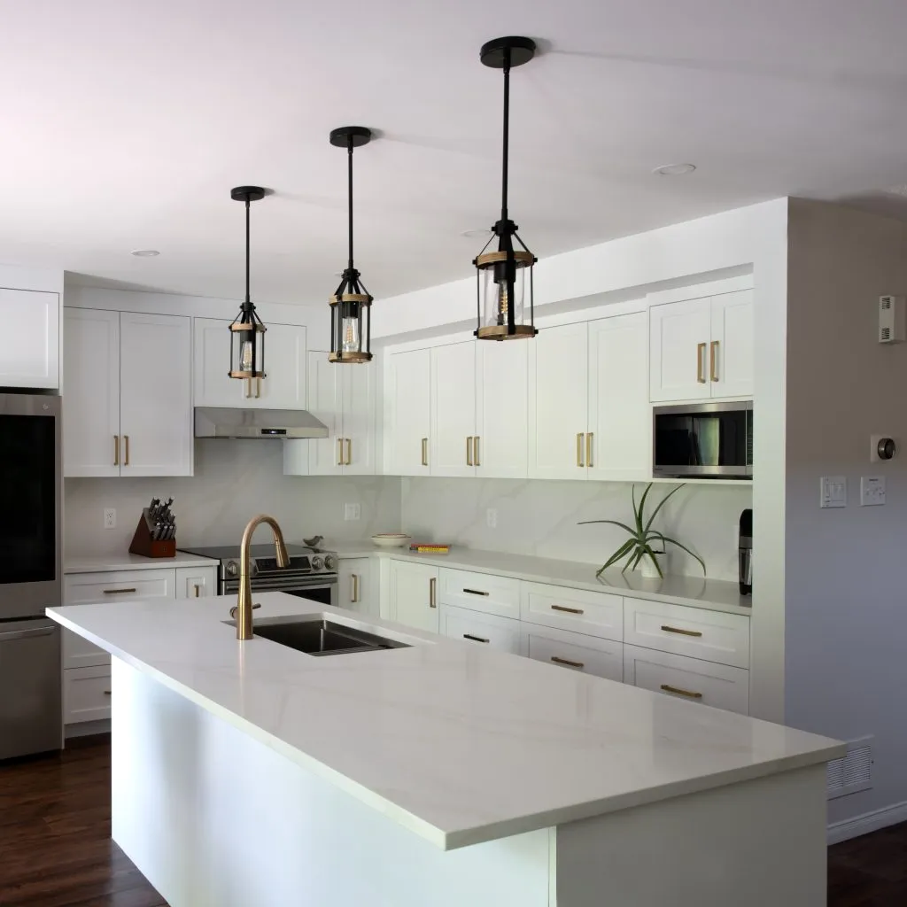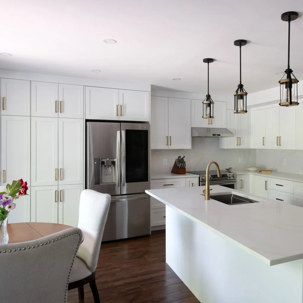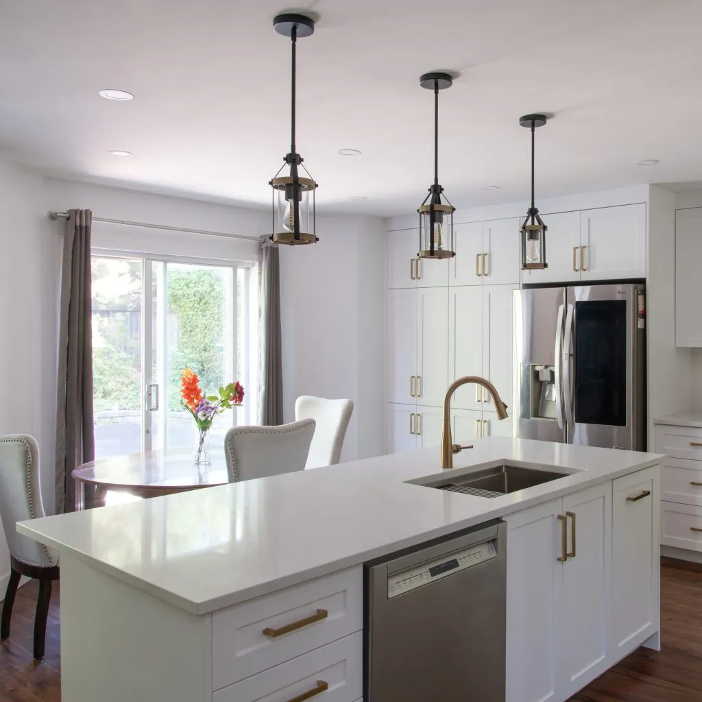 This project was a full demolition of an older kitchen, clearing the way for a fresh, modern layout. The electrical was upgraded to include pot lights for bright, even illumination, three pendant lights suspended elegantly over the island, and dedicated outlets for the island, fridge, and dishwasher.