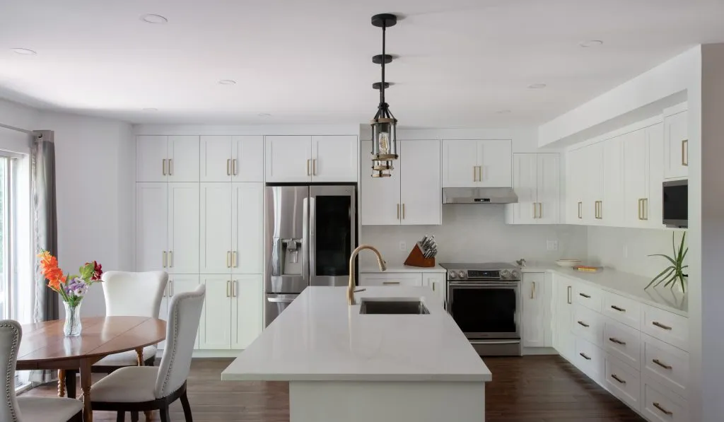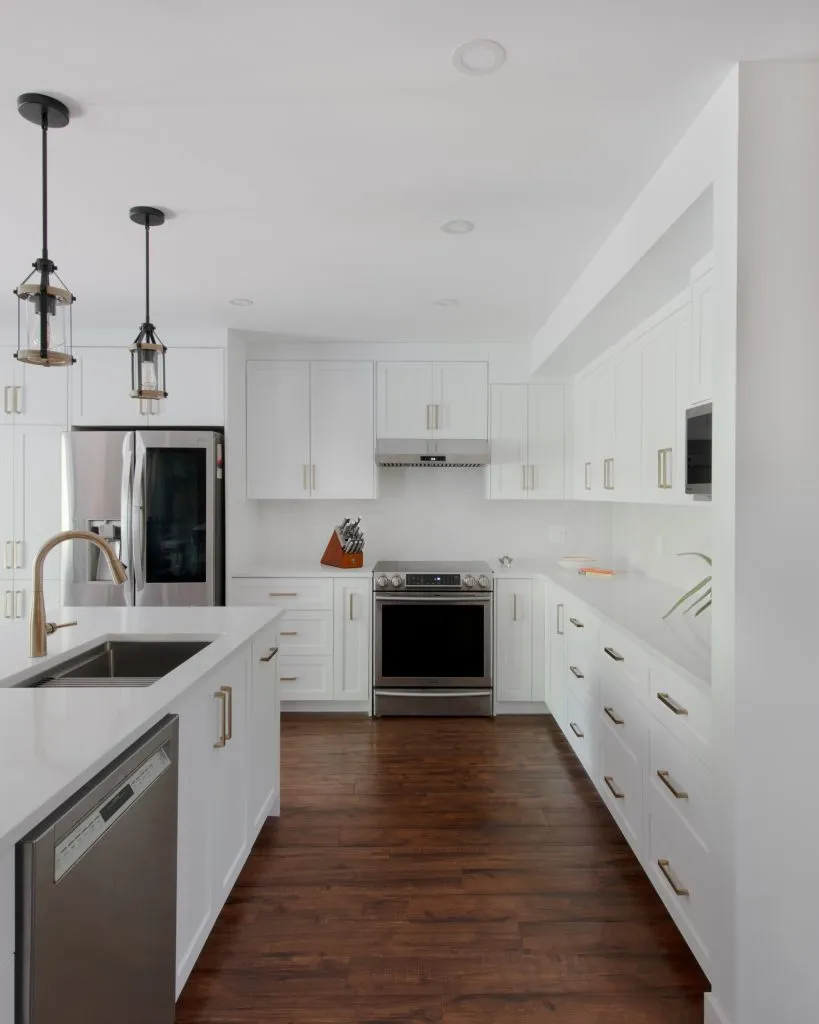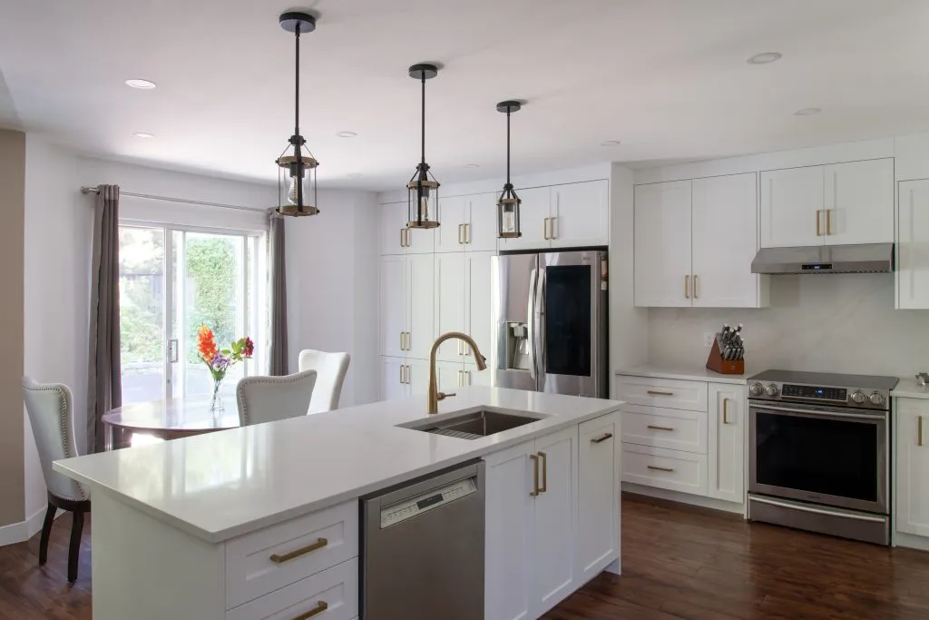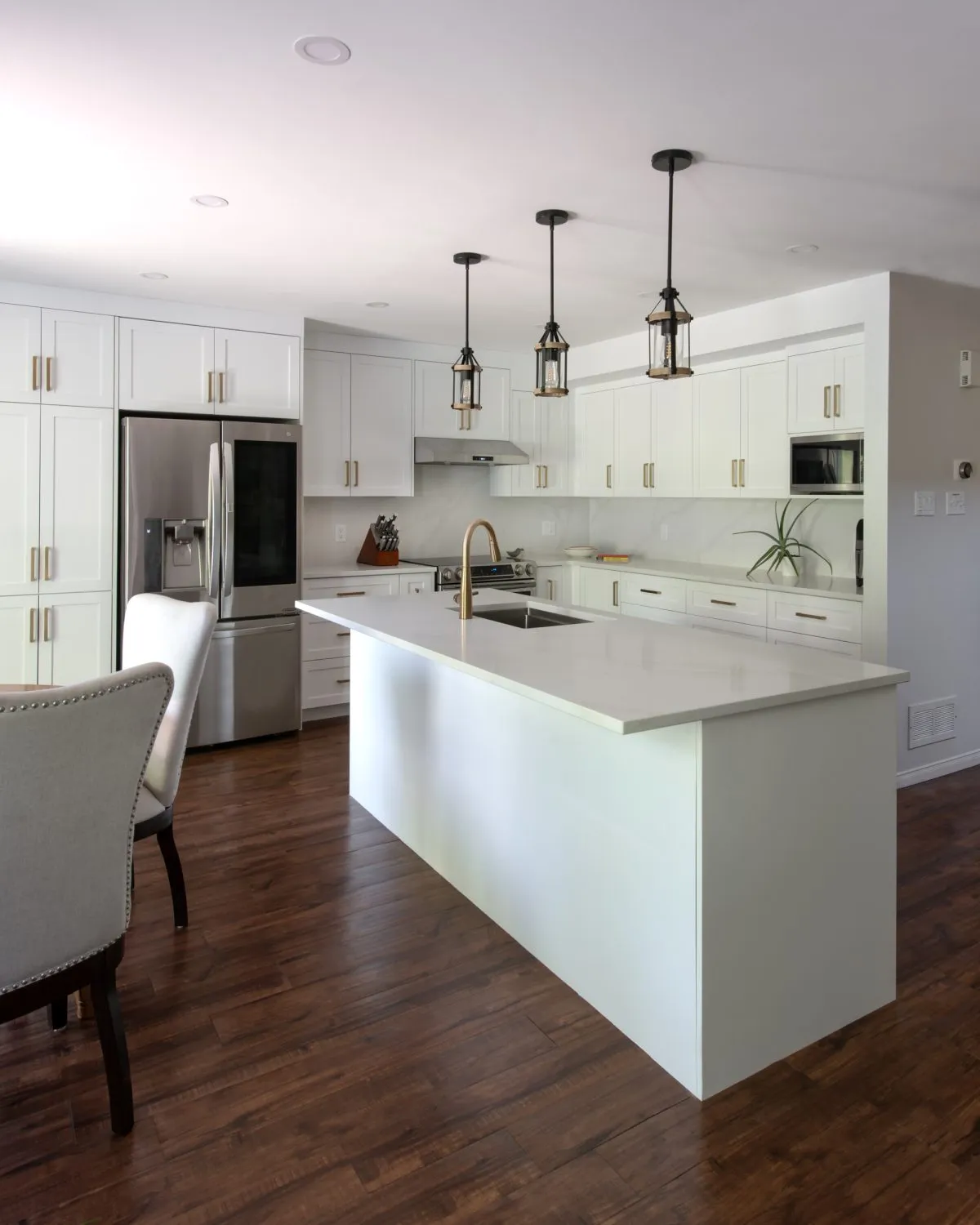 This project was a full demolition of an older kitchen, clearing the way for a fresh, modern layout. The electrical was upgraded to include pot lights for bright, even illumination, three pendant lights suspended elegantly over the island, and dedicated outlets for the island, fridge, and dishwasher.