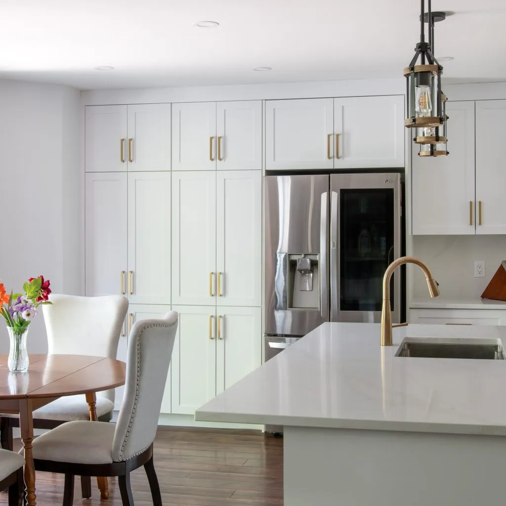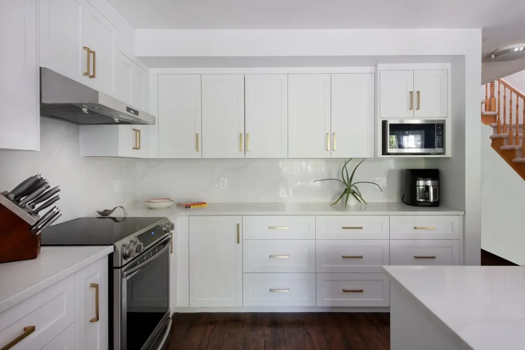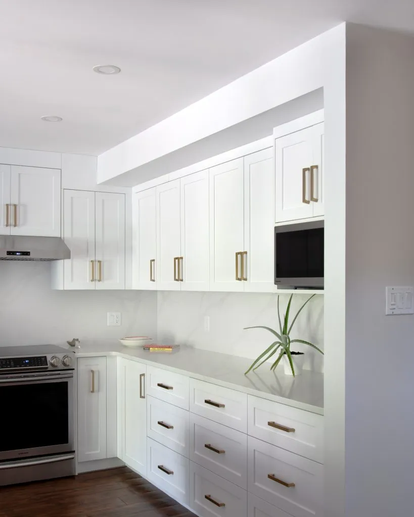 The cabinets are Sublime Collection in P734 White that exude a crisp, airy elegance that brightens the space. The shaker-style doors add a touch of classic charm, striking a balance between modern minimalism and traditional warmth. Integrated LED channel lights cast a soft, inviting glow, highlighting the cabinetry’s clean lines and creating an ambiance that’s both cozy and chic.